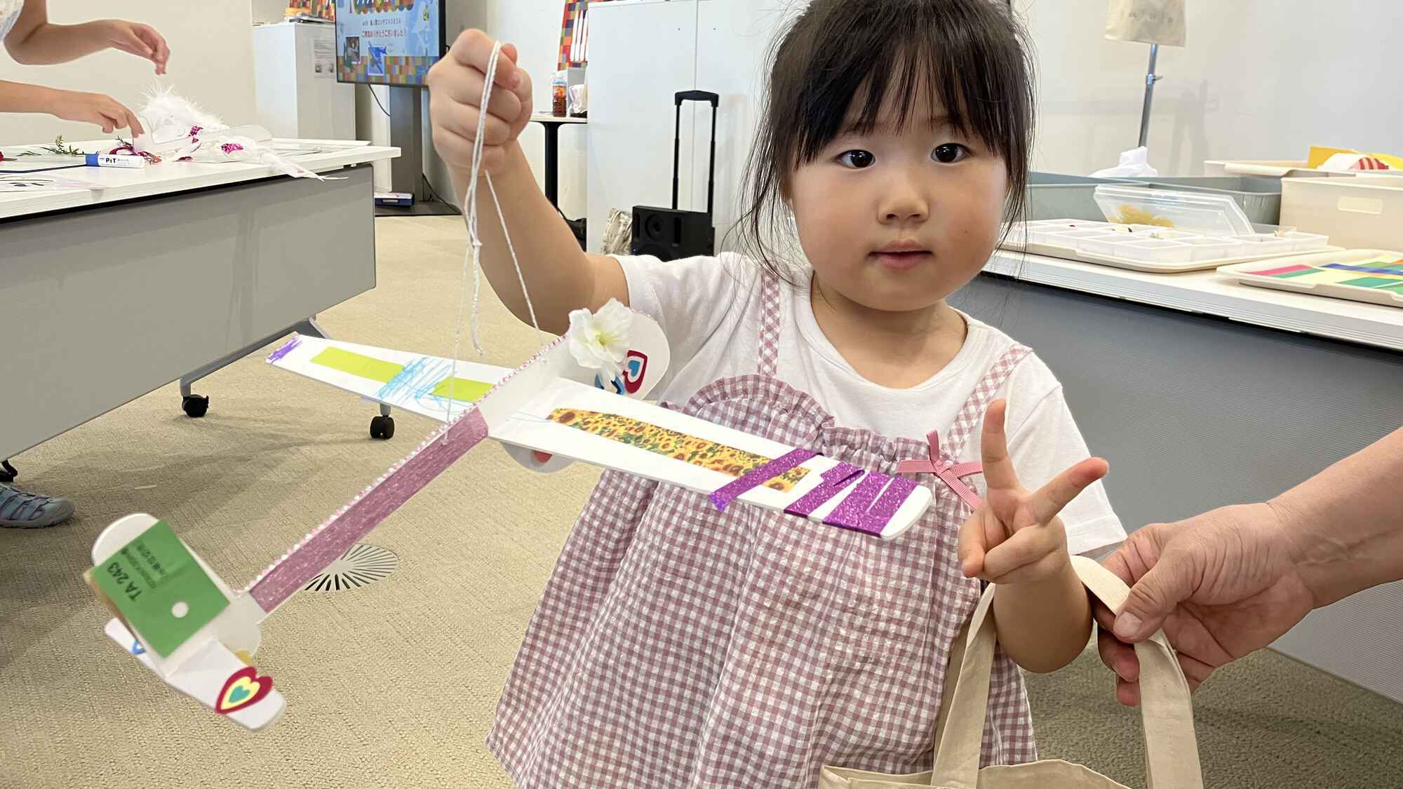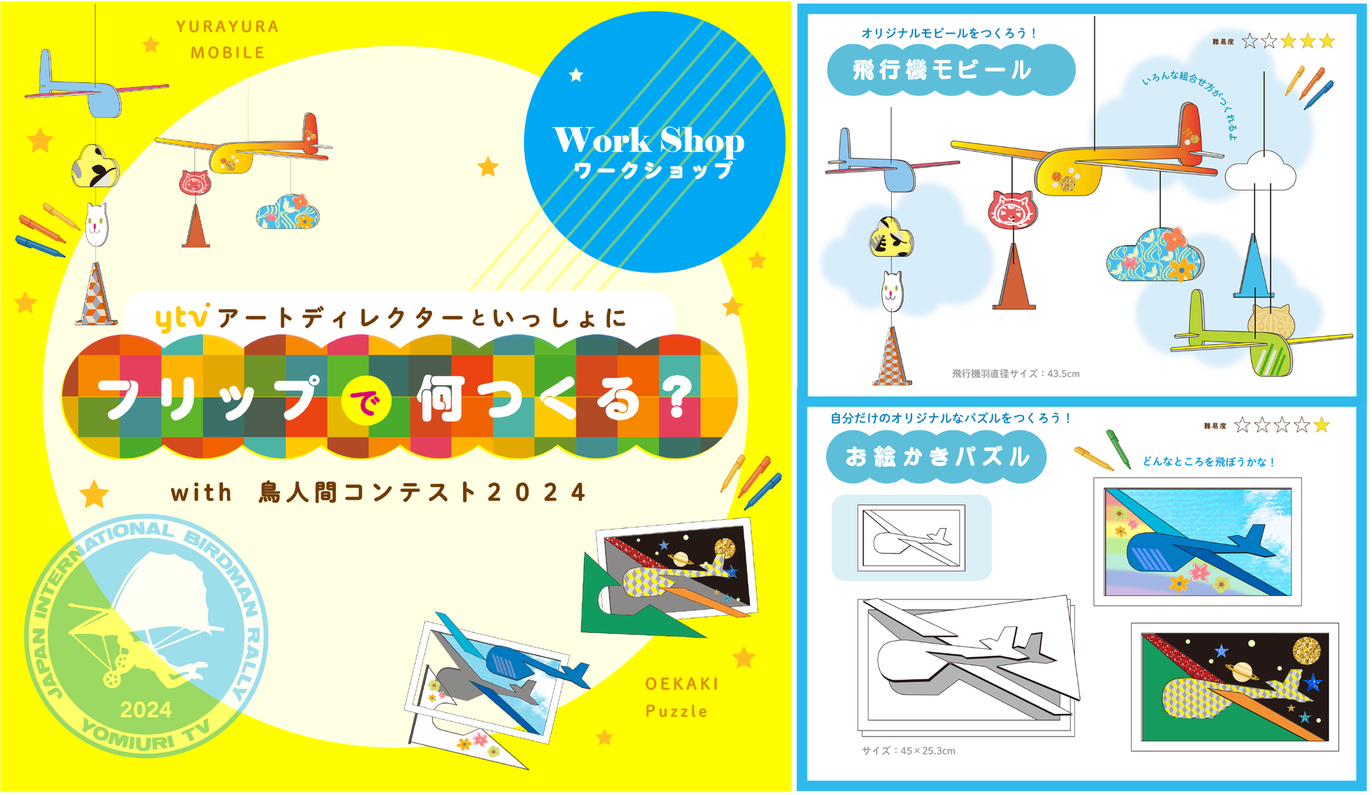 読売テレビ「鳥人間コンテスト」とコラボした企画を実施しました!飛行機の機体をモチーフにした「モビール」と「パズル」の2作品を展開。新たに「衣装で使用した布の“はぎれ”」も工作の素材として美術協力会社よりいただきました!色鮮やかでキラキラとした布やリボンは、飛行機の羽につけたり、装飾のアクセントにうってつけです。