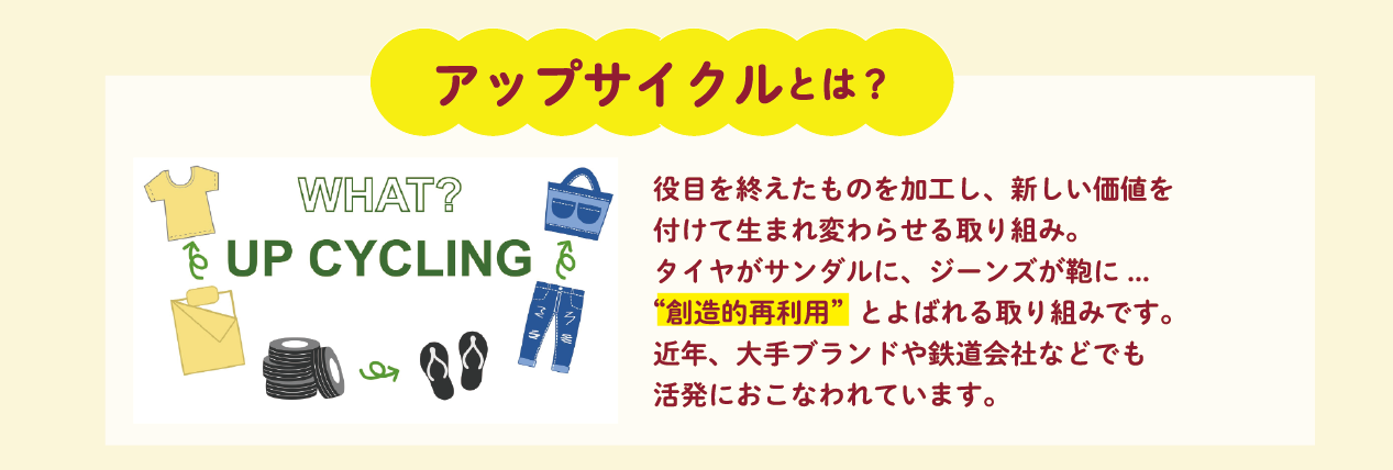 「アップサイクル」は、「リサイクル」や「リユース」とは異なり、役目を終えたもの(廃棄される予定のもの)にアイディアやデザインを加えて加工し、新たな価値を生み出す取り組みです。