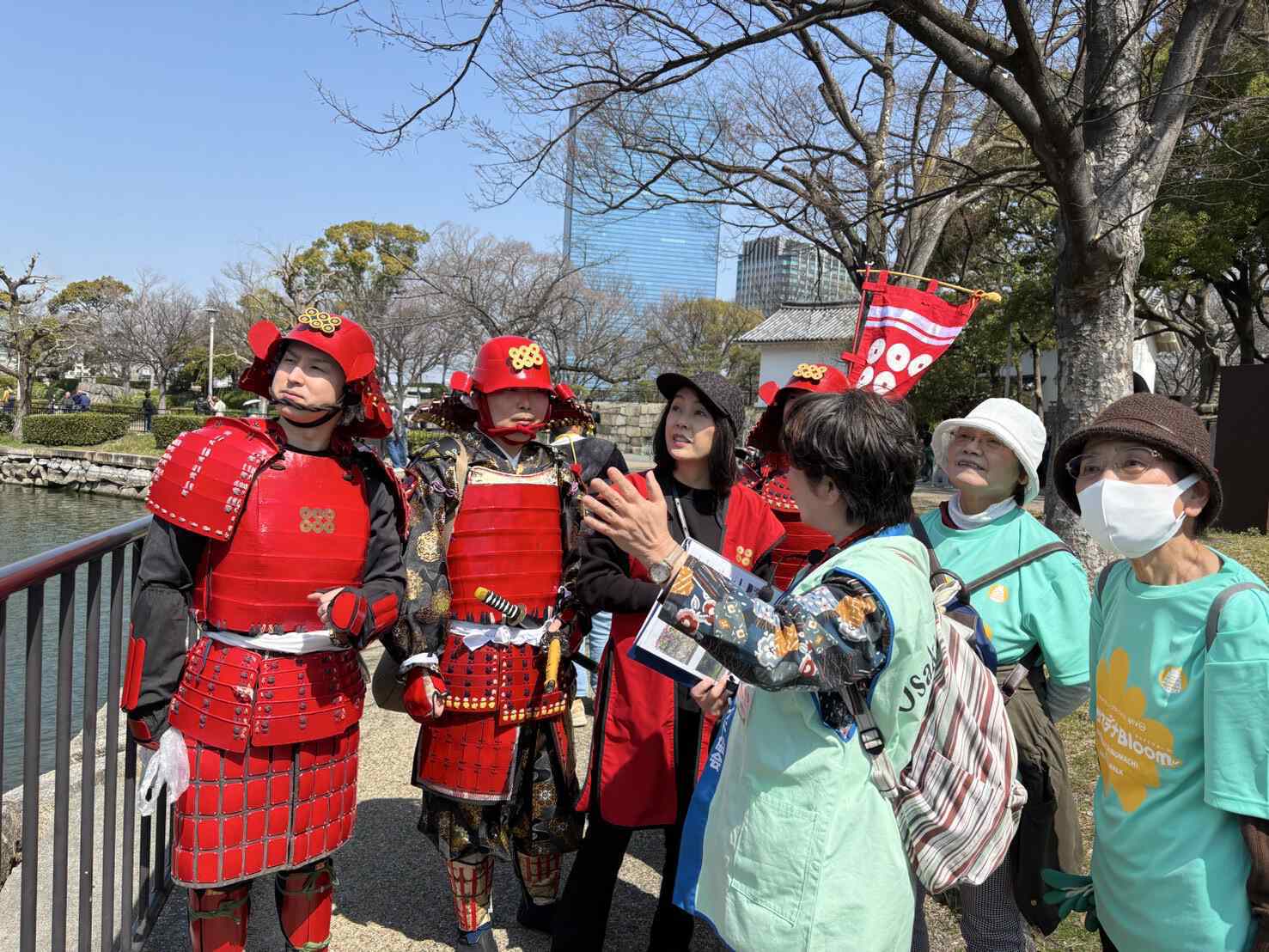 毎月第3日曜日に、大阪城公園の周辺で清掃活動を行っているボランティア団体です。手作りの甲冑着は細部に至るまで精巧に再現されており、毎月の活動には外国人の参加も多いそうです。