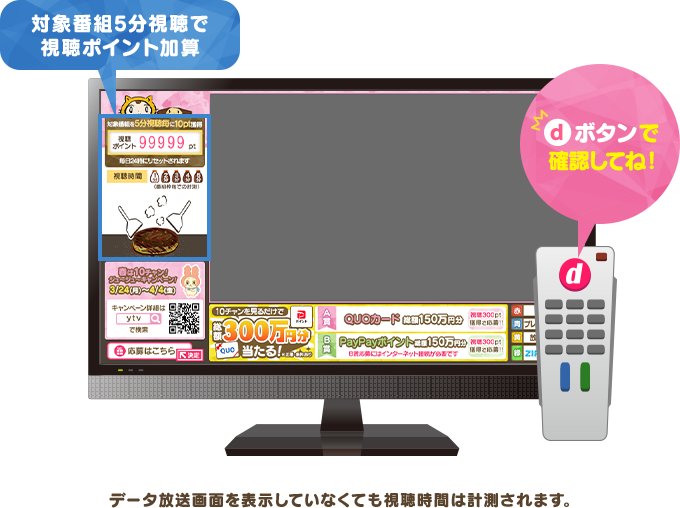 視聴ポイント獲得状況やQUOカードの応募パスワード・PayPayポイントのコード番号はデータ放送画面で確認してね。
