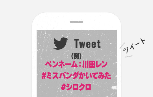 - シロクロ公式アカウントをフォローし、ハッシュタグ「#ミスパンダかいてみた #シロクロ」の両方を付けて描いたもの、撮影したものをツイッターに投稿!ペンネームの記載を希望される場合は、投稿時に追加して一緒に送ってね!
