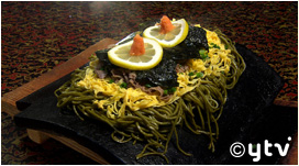 熱した瓦の上に「茶そば」を盛り合わせた名物料理。