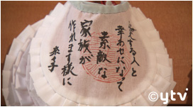 こちらでは絵馬ではなく、前掛けに願いごとを書くんですよ!