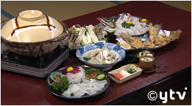 八寸(前菜)、活クエの薄造り、クエ鍋、クエの茶碗蒸し、雑炊、食後のフルーツ