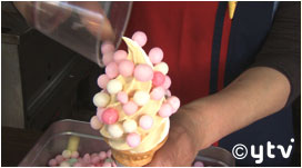 縁起物のカラフルな米菓子「おいり」をトッピングしたソフトクリーム。