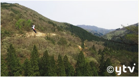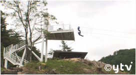 山の尾根に張ったワイヤーを滑走するメガジップライン。