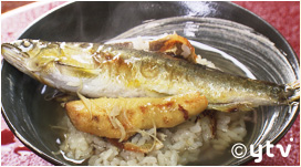 ご飯の上にカマボコや三つ葉をのせ、カツオダシをかけて食べる
