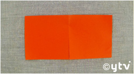 1、正方形の折り紙を半分に切って長方形にし、その長方形の中央部分に下半分切れ目を入れます。