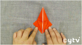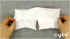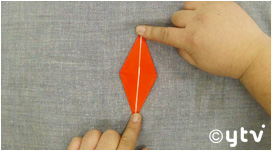 4、開いている側を中央に三角形に折り曲げ、それを広げてひし形にします。【反対側も同様】