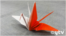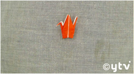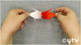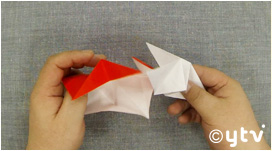 そのひし形を広げて、紅白になるように振りながら形を戻します。