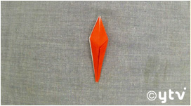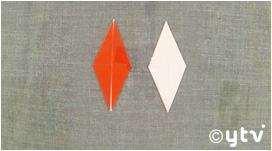 6、紅白にできたひし形の開いている側を半分に折り、中折りと外折りにします。【反対側も同様】