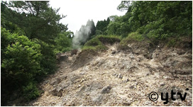 獣道を進むと、あちこちから蒸気が立ち昇る神秘的な岩山が!この岩山全体が、