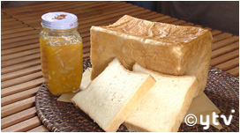今回は特別に、お店の一番人気「もちもち食パン」にマーマレードをつけて
