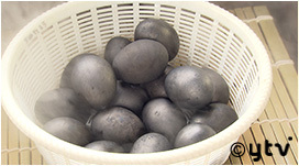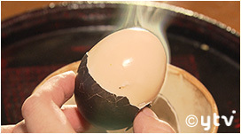 明礬温泉の硫黄成分が卵の殻と科学反応を起こすことで殻が黒くなるという珍しい卵です!