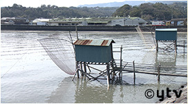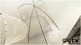 干潟ならではの漁。干潮・満潮の時間帯に網を海底におろして、