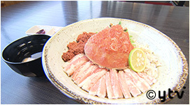 まつだせいこ丼とは、蟹のガラでとった出汁で炊き上げたご飯に、