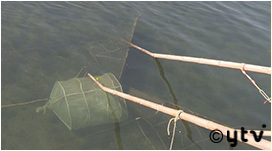 竹さおの先につけた「カゴ網」と水中に立てた「誘い込み板」で捕まえます。
