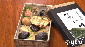 木造駅舎の嘉例川駅でいただく「かれい川弁当」。