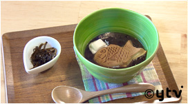 マシュマロの帽子をかぶった鯛焼き入りぜんざい。