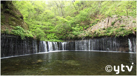 70mもの幅にわたって滝水が白糸のように流れ落ちる軽井沢の名勝。