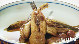 ぶつ切りのガンバと季節の野菜を甘辛炊きにした「がねだき」は
