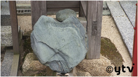 境内にあるハート型の石を胸の位置まで持ち上げて、