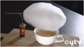 温かいコーヒーの水蒸気で綿菓子が下に落ちて行く様子が、