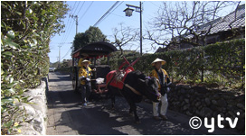 地元のアイドル、黒毛和牛の雌牛「ちはるちゃん」牛車に乗って