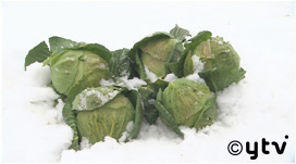 畑の上に雪が積もるのを待ってキャベツを収穫。
