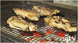 地熱蒸気で3時間じっくり蒸し、冷ました後炭火で炙ります。