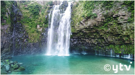 遊歩道を20分程歩くと目前に現れるのが、エメラルドグリーンに輝く「雄川の滝」!