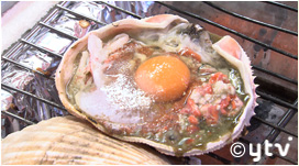 店頭で網焼き販売されている旬の魚介類は、東尋坊商店街の散策にぴったりな