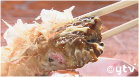 高岡流のお好み焼き。小麦粉の代わりに魚のすり身を使用、