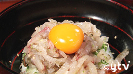 次に、天然の魚や貝を大葉、昆布、卵で和えて頂きます。