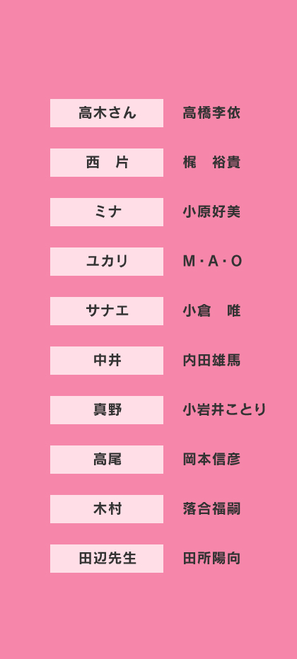 高木さん:高橋李依 西片:梶 裕貴 ミナ:小原好美 ユカリ:M・A・O サナエ:小倉 唯 中井:内田雄馬 真野:小岩井ことり 高尾:岡本信彦 木村:落合福嗣 田辺先生:田所陽向