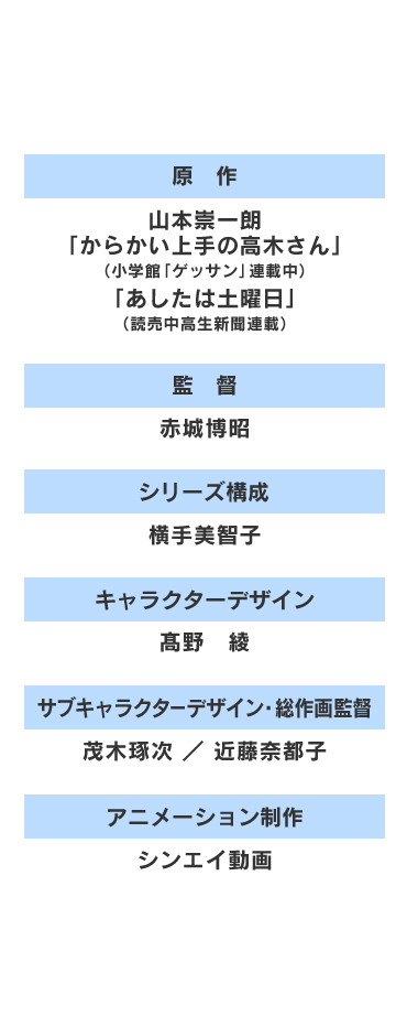 原作:山本崇一朗「からかい上手の高木さん」(小学館「ゲッサン」連載中)「明日は土曜日」(読売中学生新聞連載) 監督:赤城博昭 シリーズ構成:横手美智子 キャラクターデザイン:髙野 綾 サブキャラクターデザイン・総作画監督:茂木琢次/近藤奈都子 アニメーション制作:シンエイ動画