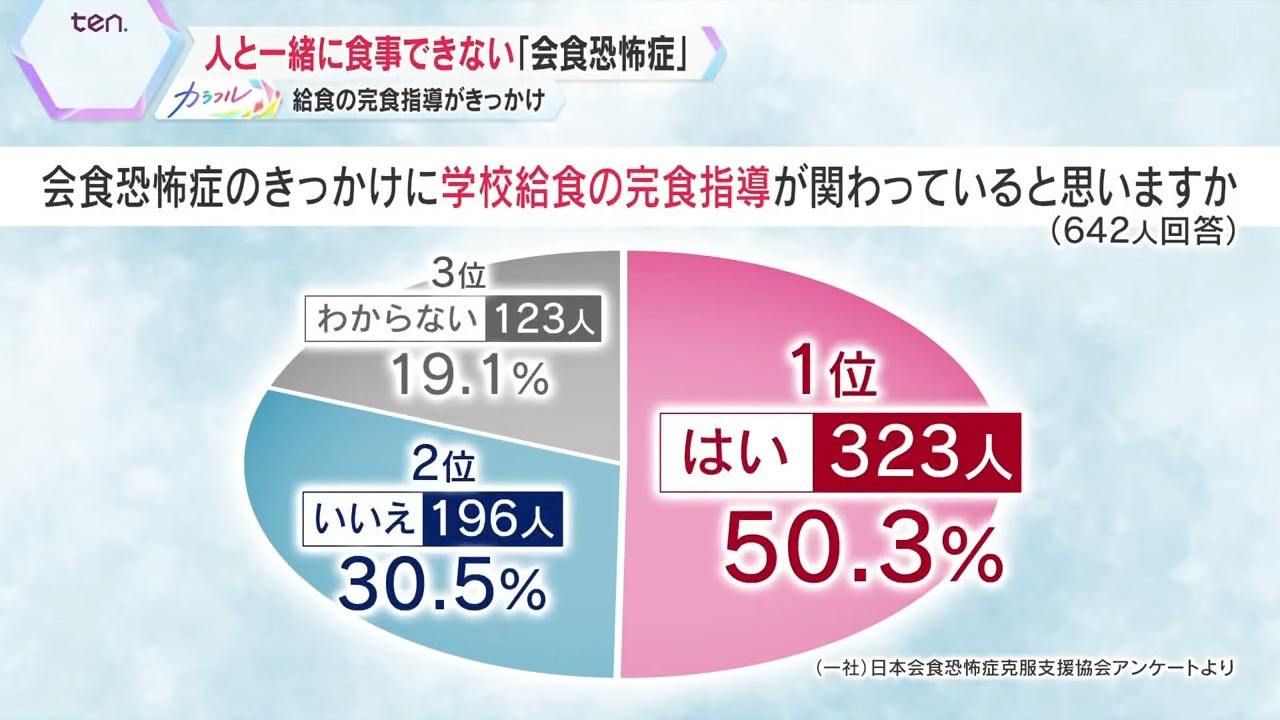 部活動や学校給食での、“残さず食べること”を指導する完食指導。日本会食恐怖症克服支援協会のアンケートでは、2人に1人が「発症のきっかけに給食の完食指導が関わっている」と答えています。