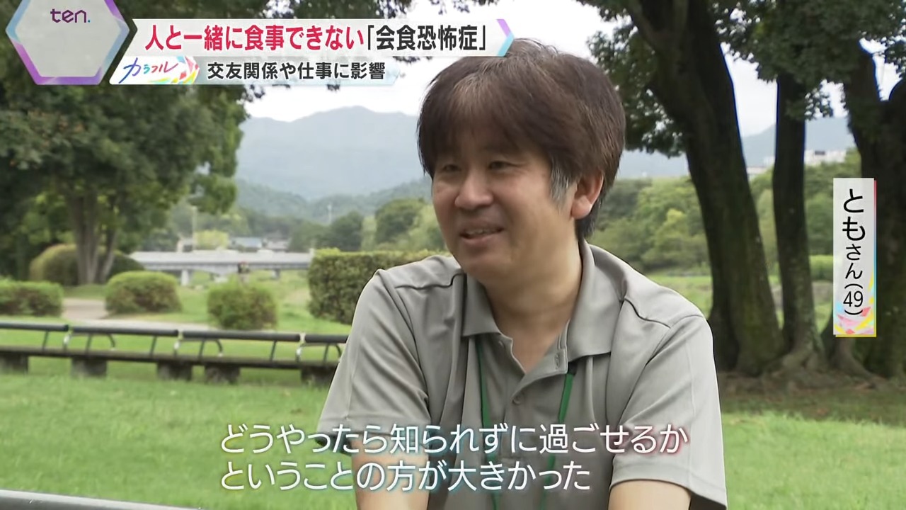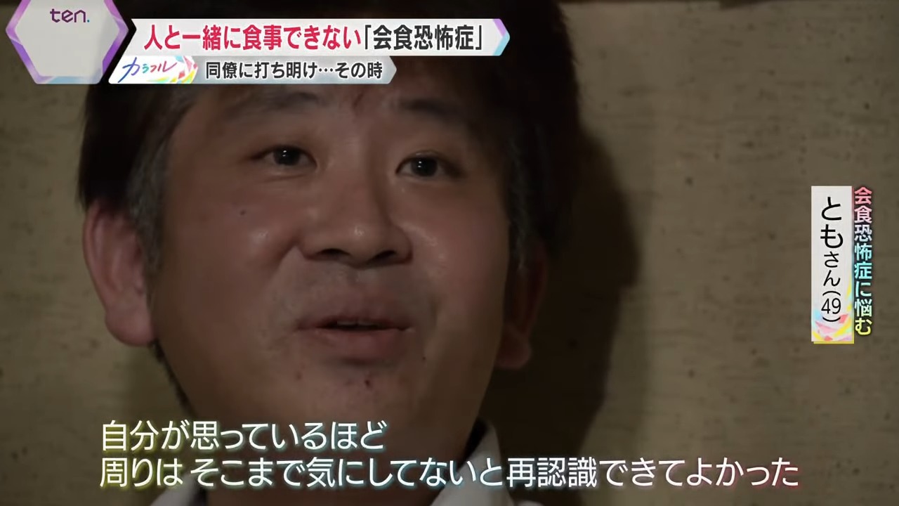 ともさんが小学生の時から40年以上抱えているのが、『会食恐怖症』です。人と一緒に食事をすることに強い不安や恐怖を感じる、『社交不安症』という心の病気のひとつ。家族や親しい友人など限られた相手とは食事できる人もいれば、水を口にすることすら難しい人もいます。度合いは、人それぞれです。