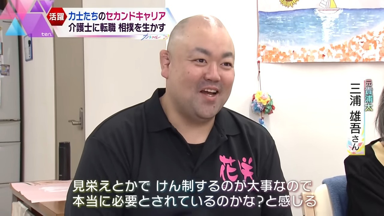 「相撲という仕事をやめたあと、何もなかった。仕事がない、何もできない、学もない、というところで悩んでいたときに声をかけていただいて、そこから介護のほうに。相撲取りをやっていたときって、高齢者の方に応援していただいていました。恩返しというわけではないですけど、お役に立てるのではないかなと思っています」