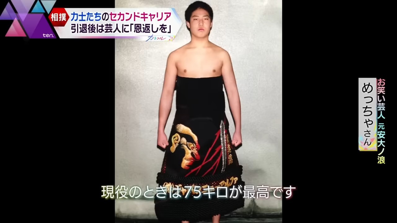 さらに、元力士は“お笑いの世界”にも。吉本興業所属のお笑い芸人・めっちゃさんは、中学校卒業と同時に入門し、「安大ノ浪」の四股名で3年間土俵を務めました。