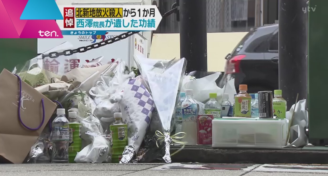放火されたクリニックが入るビルの前には多くの花が手向けられた