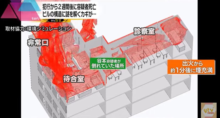 この事件で亡くなった25人のうち24人が当日に死亡。1人も4日後に死亡が確認された。最大の謎は、なぜ火をつけた本人である谷本容疑者の死が2週間後だったのか?ということだ。その謎を解くため、事件当時の状況についてコンピューター解析を依頼し、室内の煙の動きをCGで再現した。(写真5参照)赤色で示した煙は数秒間で出火現場に近い待合室に充満した一方、奥の診察室が煙で満たされたのは出火からおよそ1分後。待合室と診察室の間の谷本容疑者が倒れていた場所は、診察室よりかなり早く煙が充満したとみられる。