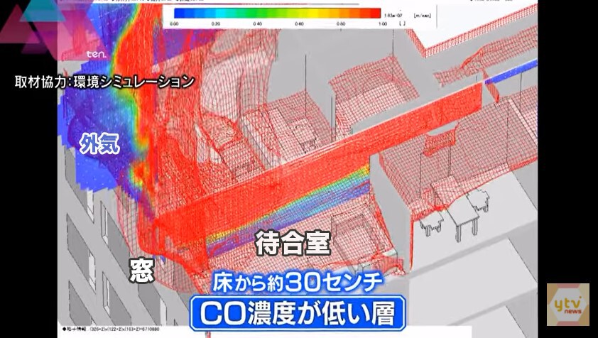 しかし、待合室には表通りに面した窓から、青色で示した大量の外気が流入し、煙はやや上方へ押し上げられ、一酸化炭素濃度の低い空気の層が、床からおよそ30センチの高さでできていたことがわかった。(写真5参照)