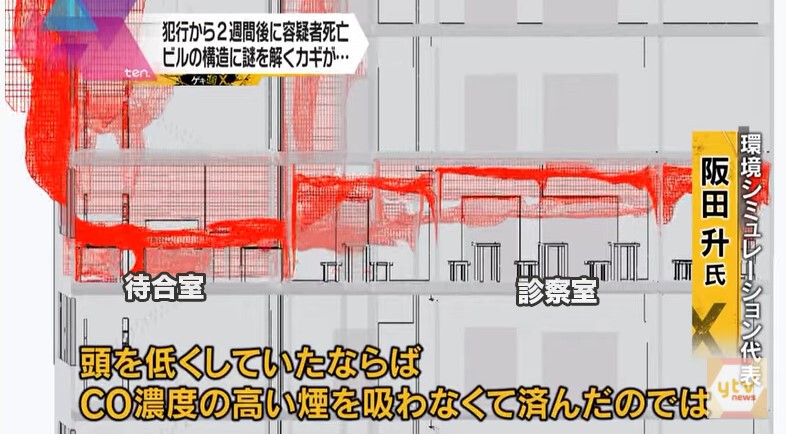 「屋内で煙が充満しやすい。被害者は逃げ場を失っていた。一酸化炭素は無色・無臭で気付かないうちに体の中に取り込まれて、最初は頭痛や吐き気がなどの気分不良が出るが、症状に気づく前に意識を失っていた可能性が高い。クリニックの出口は、犠牲になられた方々が倒れていた場所とは反対方向なので、逃げるには炎を通り抜けないといけない。そこに容疑者が立ちはだかっていたなら、それを振り払ったり、抑止していると、1分未満で避難するのは非常に難しい。そうやっている間に意識を失って倒れる可能性がある。」(上田敬博医師