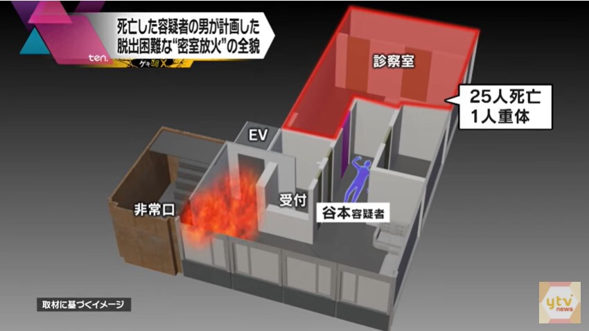 あの日、谷本容疑者はエレベーターの前で持ってきた袋を傾け、流れ出したガソリンにライターのようなもので点火。ほとんどの人がクリニックの奥へと逃げようとする中、もう一つの紙袋を非常口に向けて投げつけたため、現場で唯一の避難路が炎に包まれたとみられる。さらにこの後、非常口から逃げようとする1人に対し、避難の妨害を狙ったのか、体当たりするように突進する様子も防犯カメラに映っていた。救急隊が駆け付けた時、谷本容疑者はクリニックの奥の診察室側と待合室側を仕切る扉の手前側に倒れていた。閉まっていた扉を開けると、26人が心肺停止の状態で倒れていたという。