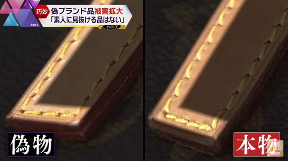 比較すると、偽物の方が本物よりも縫い付ける間隔が若干広くなっていることが分かります。さらに、より精巧な偽物を私たちに見せてくれました。
