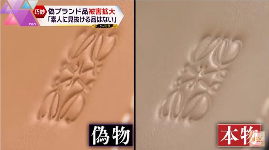 「ロエベのショルダーバッグですが、刻印の部分が、偽物の方は少し押しが強いものになっていて、指に当たると痛いまではいかないけど違和感というか、ざらっとしたような感じがあって、本物だと滑らかな刻印になっているので、指に気持ちいいものになっています」(株式会社RECLO 小坂哲矢鑑定士)