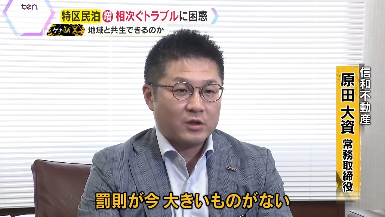 『信和不動産』原田大資常務取締役は、今の特区民泊の制度の問題点について、「今は大きい罰則がない。今後、制度設計で、特区民泊として運営をきっちりやっている事業者と、そうでない事業者との明確な線引きをしてもらうといい」と指摘しています。