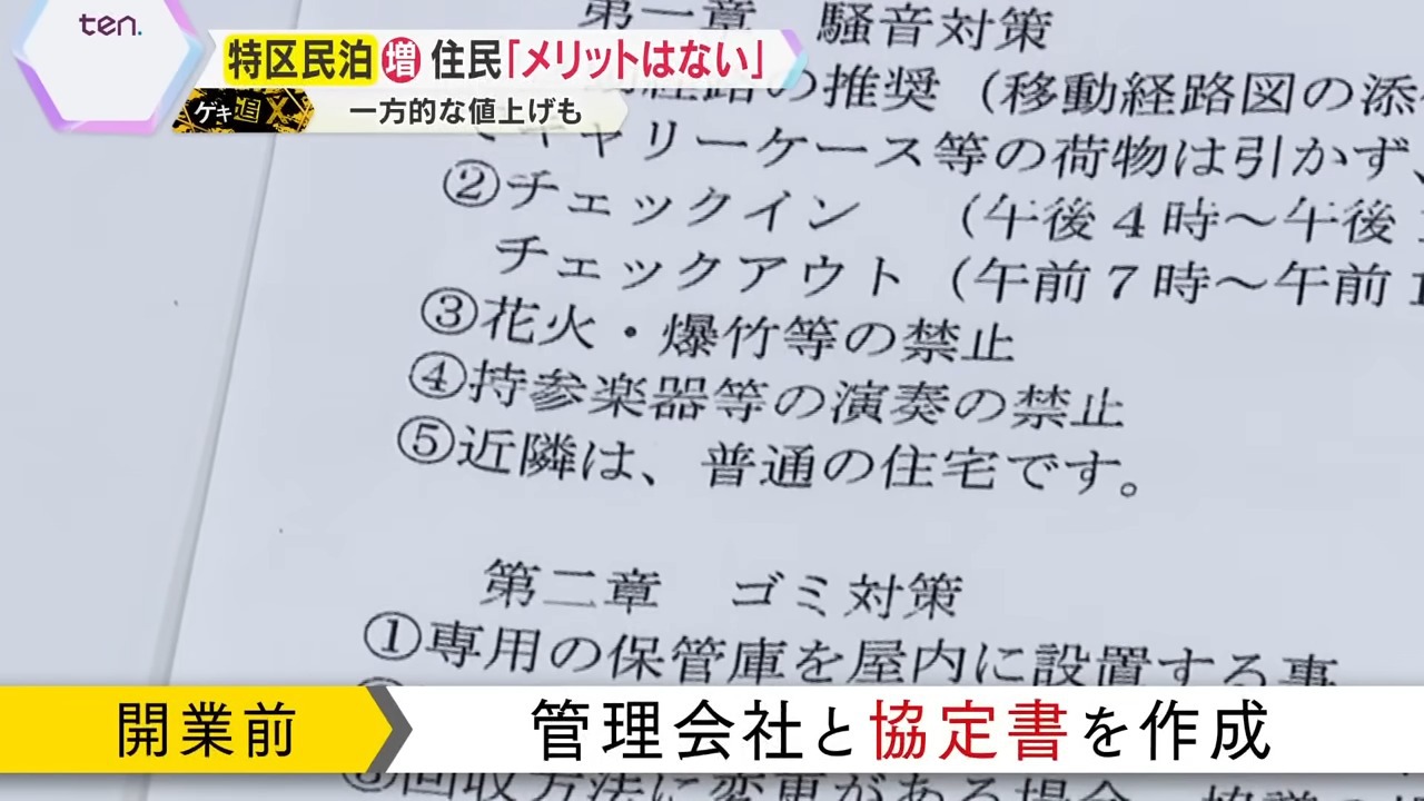 町内会は、民泊の開業前に管理会社との間で協定書を作成し、「花火・爆竹等の禁止」や「ゴミ出し」「喫煙」のルールなどを定めていましたが、開業後、ルールを逸脱する行為が相次いで起きているといいます。