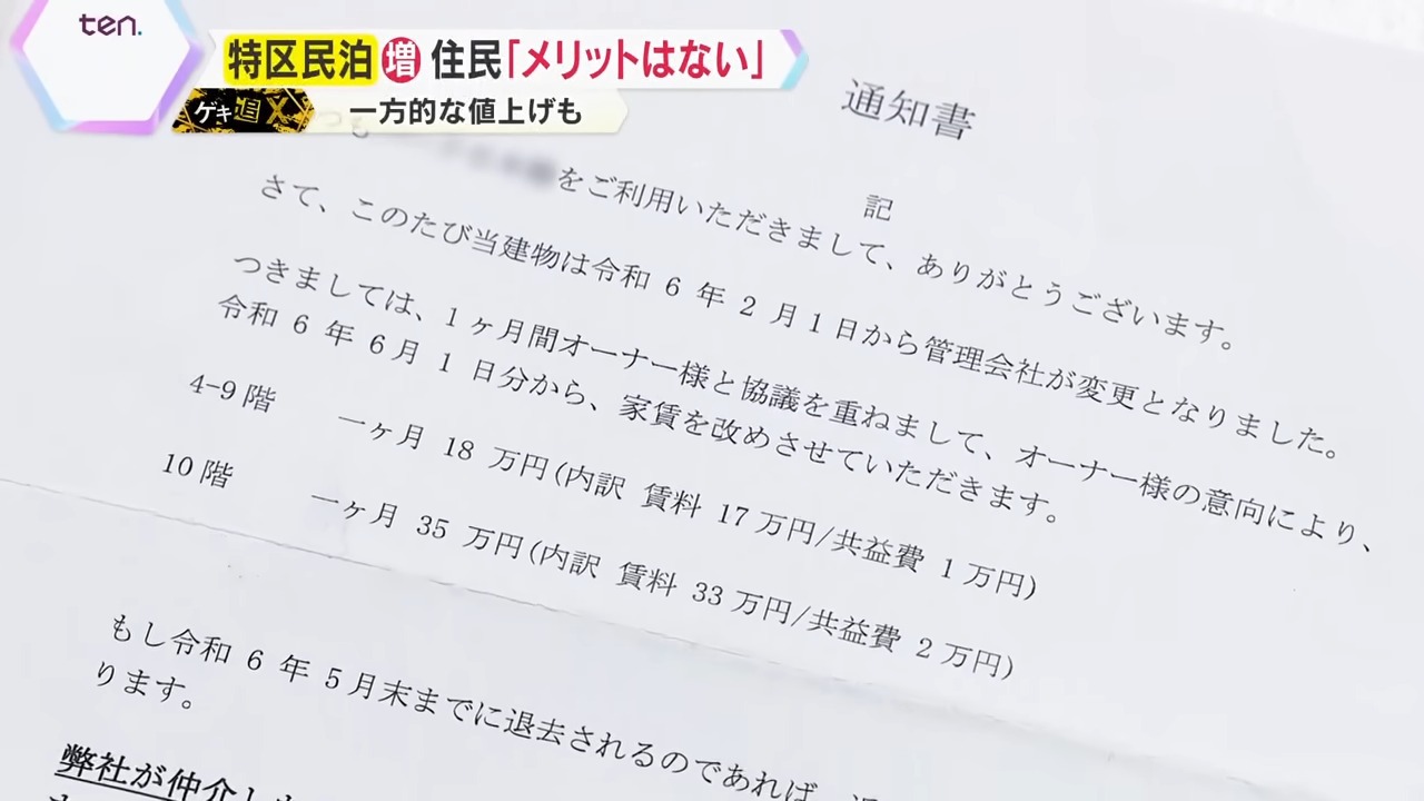 急増する特区民泊の中には、周辺住民の生活に大きな影響を及ぼしかねないケースも発生しています。2024年3月、大阪市浪速区のマンションの住民に突如届いたのは、管理会社から家賃の“値上げ”を求める通知です。その後、送られてきた書類には、「マンションで民泊を開業する」と記載されていました。